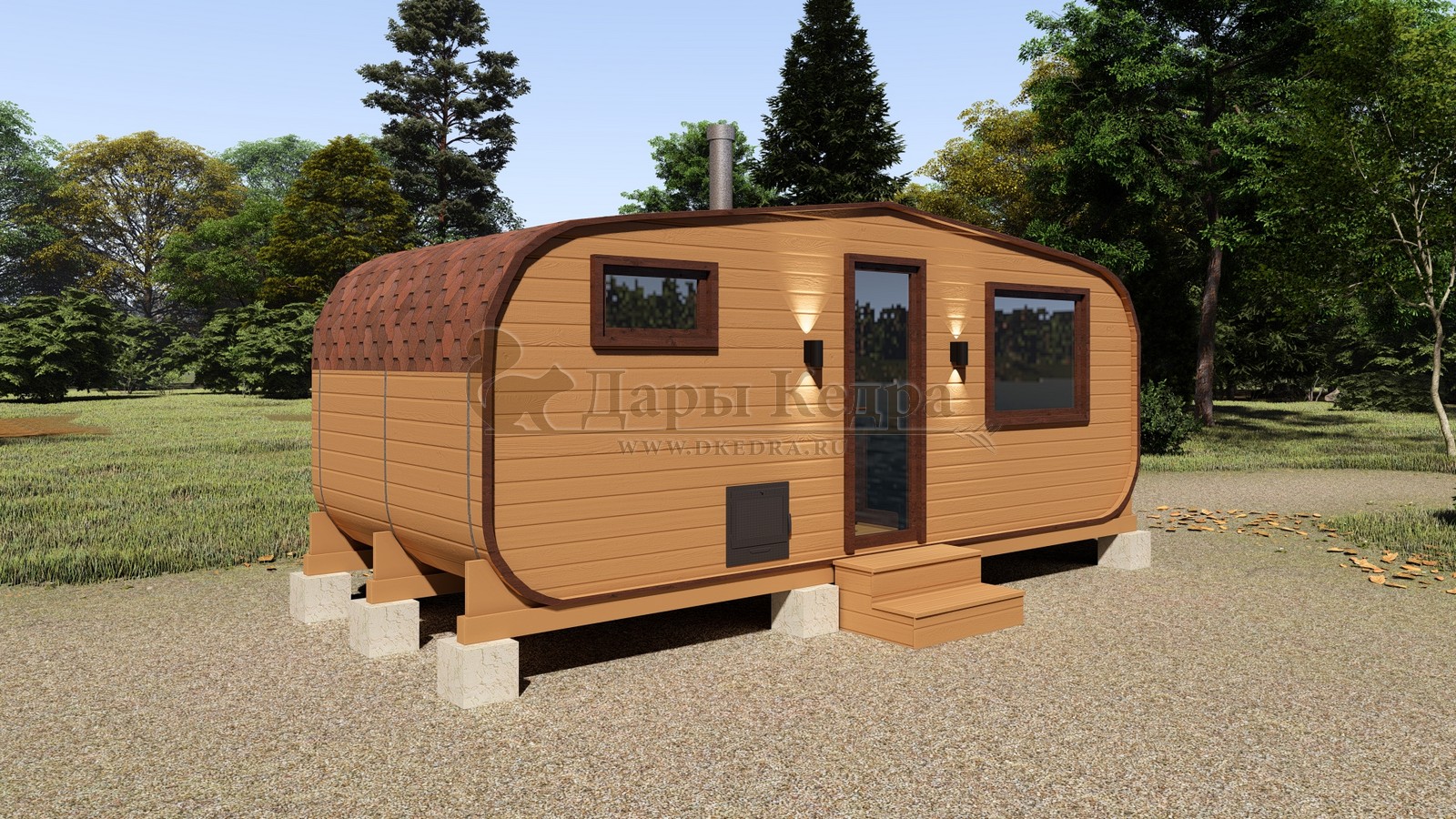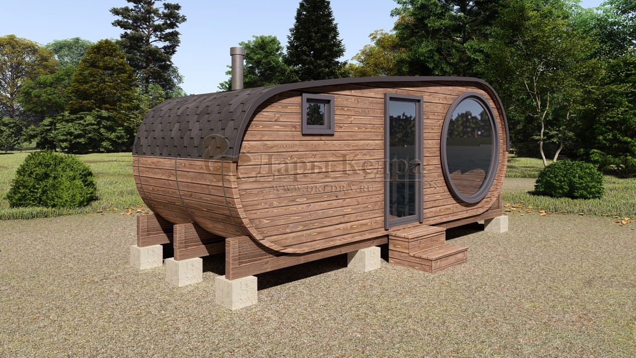 Баня-бочка круглая из кедра 3 метра Это изделие круглой вытянутой формы с двумя отделениями: раздевалкой и парной. Лавочки из кедра находятся по всей длине бани-бочки с обеих сторон. Печь расположена в парилке около дальней стены. Для удобства пользования в раздевалке установлена вешалка и полочка из кедра. За счет небольшой конструкции баня нагревается не более 30 минут. По вашему желанию баню-бочку можно дополнить печью с внешней загрузкой, благодаря которой весь мусор после топки останется на улице. Круглая баня-бочка не требует полноценный фундамент, поэтому при необходимости ее можно перенести в другое место. Обращаем Ваше внимание, что в стандартную комплектацию бани входят лавки в парной с обеих сторон. Дополнительно можно заказать полок открытого или закрытого типа! Кедр обладает ароматическими свойствами. Он не деформируется и влагоустойчив, при правильном уходе за деревом на нем не развиваются грибки и плесень.
