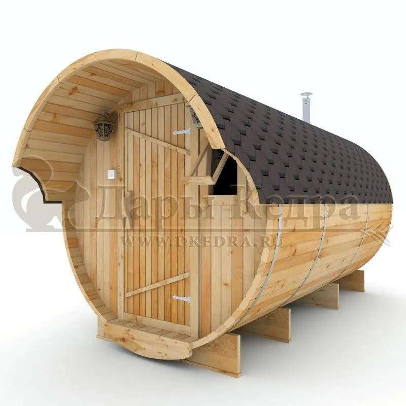Баня-бочка круглая из кедра с верандой (все размеры) Это изделие круглой вытянутой формы. На веранде можно оставить вещи или отдохнуть после процедур парения. Лавочки из кедра находятся по всей длине бани-бочки с обеих сторон. Печь расположена в парилке около дальней стены. Время растопки такой печи не превышает 30 минут. В зависимости от выбранного размера круглая баня-бочка с козырьком имеет следующую комплектацию: Круглая баня-бочка 2,5 метра - парилка; Круглая баня-бочка 3,5 и 4,5 метра - раздевалка, парилка; Круглая баня-бочка 5,5 метров - раздевалка, парилка, моечная. По вашему желанию ее можно укомплектовать печью с внешней загрузкой, благодаря которой весь мусор вовремя топки остается на улице. Круглая баня-бочка не требует полноценный фундамент, поэтому при необходимости ее можно перенести в другое место. Обращаем Ваше внимание, что в стандартную комплектацию бани входят лавки в парной с обеих сторон. Дополнительно можно заказать полок открытого или закрытого типа! Кедр обладает ароматическими свойствами. Он не деформируется и влагоустойчив, при правильном уходе за деревом на нем не развиваются грибки и плесень.