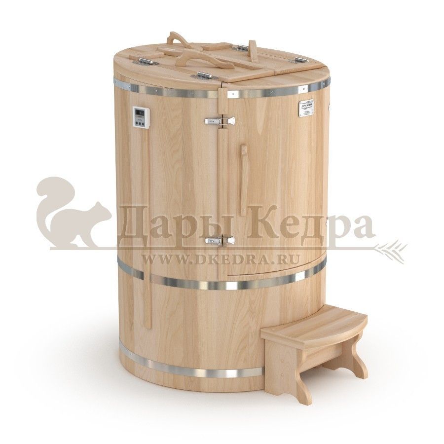 Фитобочка круглая двухрежимная может быть использована как инфракрасная сауна и парная. Карбоновые излучатели отвечают за сухое парение, они находятся на внутренней стороне стенки. Влажное парение происходит за счет поступления горячего пара в фитобочку через паропровод. Верхний скос изделия улучшает видимость и делает положение головы более комфортным. Бочка оборудована откидными створками, дверцей и отверстием для головы. Во время парения человек сидит внутри кедровой бочки, а голова находится снаружи. Благодаря этому исключается возможность перегрева. Подлокотники из кедра, встроенные ручки на створках и двери делают эксплуатацию более удобной.