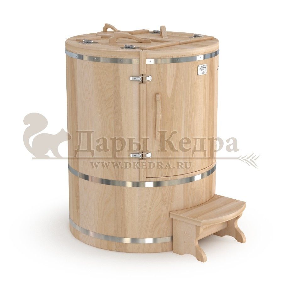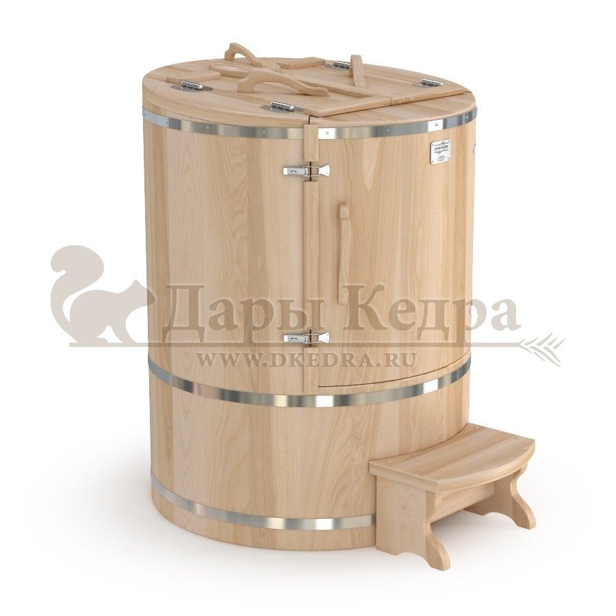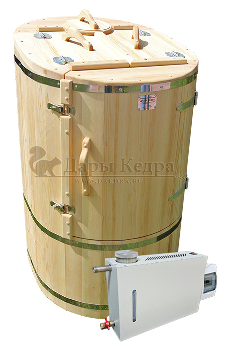 • Готовый комплект «Удобный+»: кедровая бочка с парогенератором + био-защита изнутри и снаружи Готовый комплект - это полностью укомплектованный набор с фитобочкой для процедур парения. Овальная модель более просторна и удобна в использовании. Толщина стенок составляет 25 мм. Бочка оборудована откидными створками, дверцей и отверстием для головы. Верхний скос изделия делает положение головы более комфортным и улучшает обзор. Во время парения человек сидит внутри кедровой бочки, а голова находится снаружи. Благодаря этому исключается возможность перегрева. Подлокотники из кедра, встроенные ручки на створках и двери делают эксплуатацию более удобной. Парение в фитобочке благотворно влияет на организм в целом: повышается иммунитет, выводятся шлаки и токсины, улучшается работа органов тела и состояние кожи.