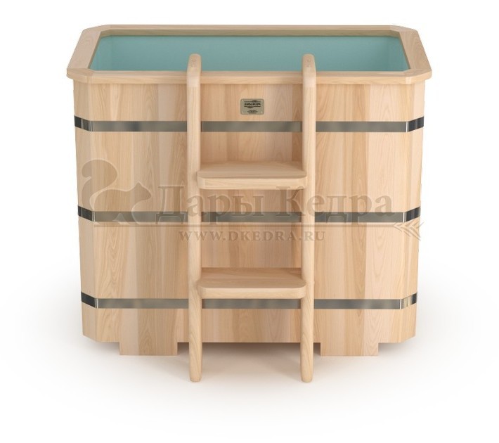 Это емкость для воды с прямоугольной пластиковой чашей. Купель предназначена для отдыха и охлаждения тела после процедур парения. Подходит для уличного и комнатного использования. Для удобства пользования овальная купель с пластиковой вставкой оснащена лавочками, приставной и внутренней лестницей из кедра.