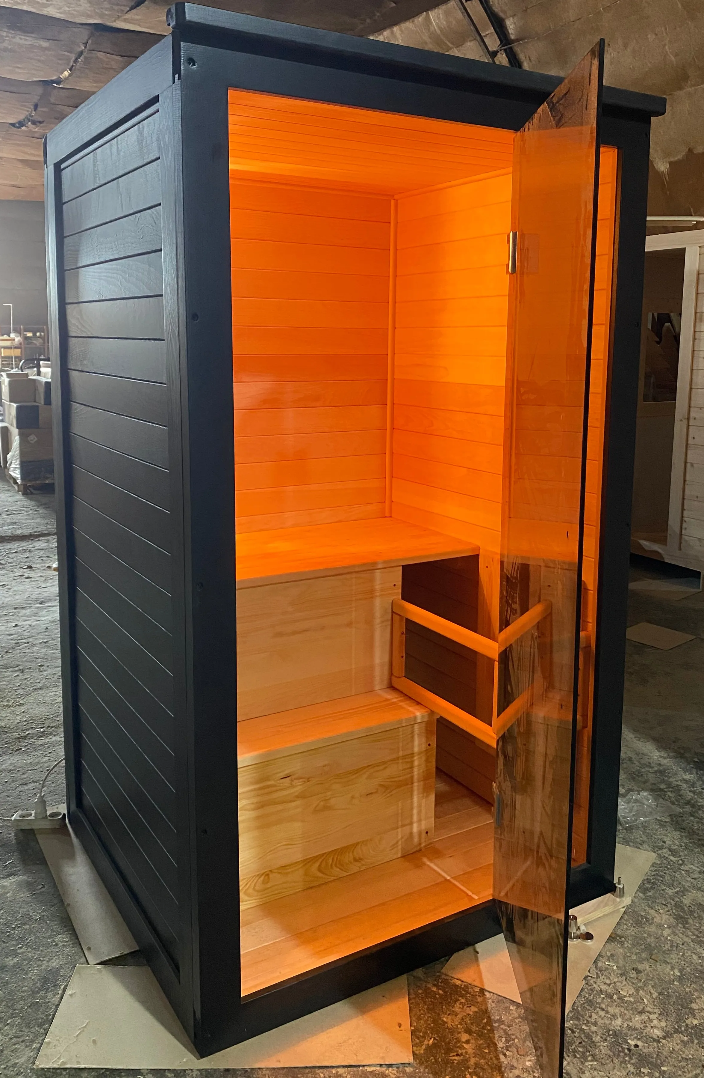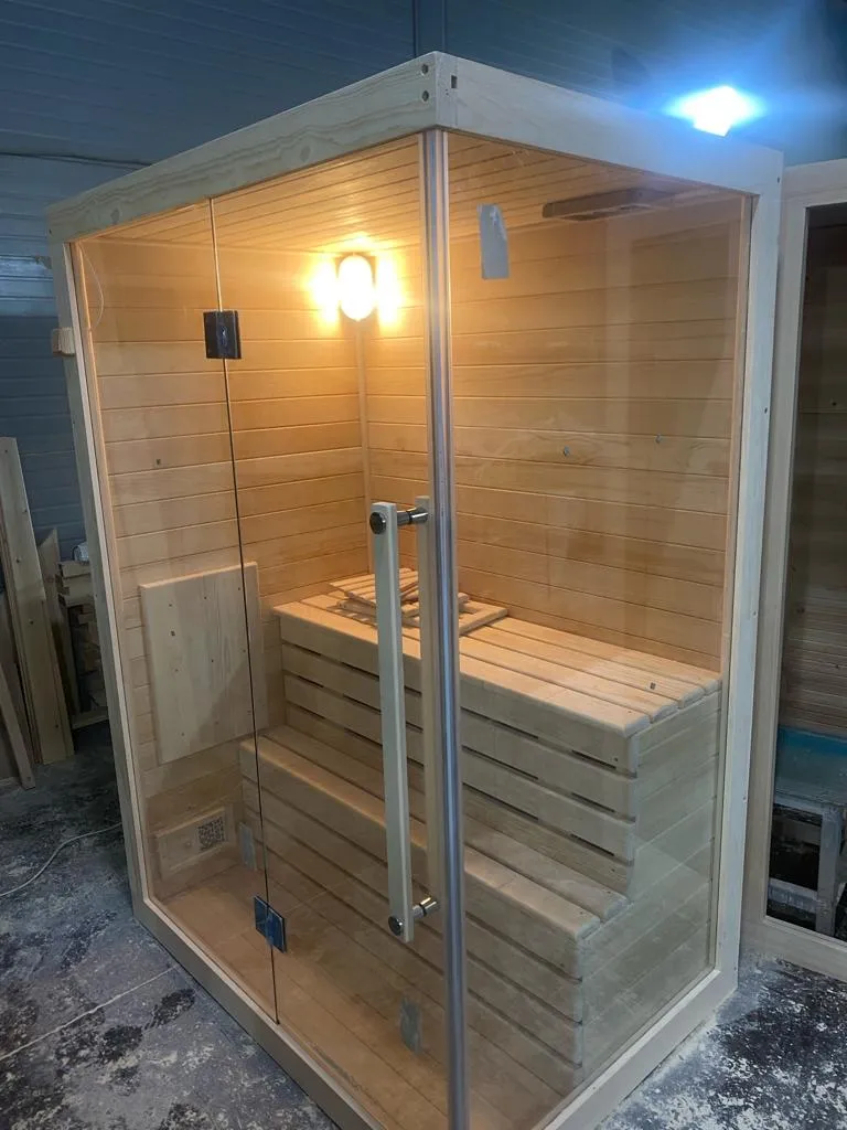 Это специально оборудованная готовая деревянная кабина для сухого и влажного парения. Электропечь нагревает пространство внутри и позволяет сбрызгивать камни водой, слегка увлажняя воздух. Такая процедура позволяет избежать перегрева. Каркас сауны выполнен из массива кедра, снаружи и внутри обшит липовой вагонкой сорта «Экстра» и имеет теплоизоляционный слой. Также двухуровневый полок идёт из кедра для обогащения внутри кабины полезными фитонцидами, а в сочетании с противовирусными свойствами липы сауна становится настоящим источником здоровья.