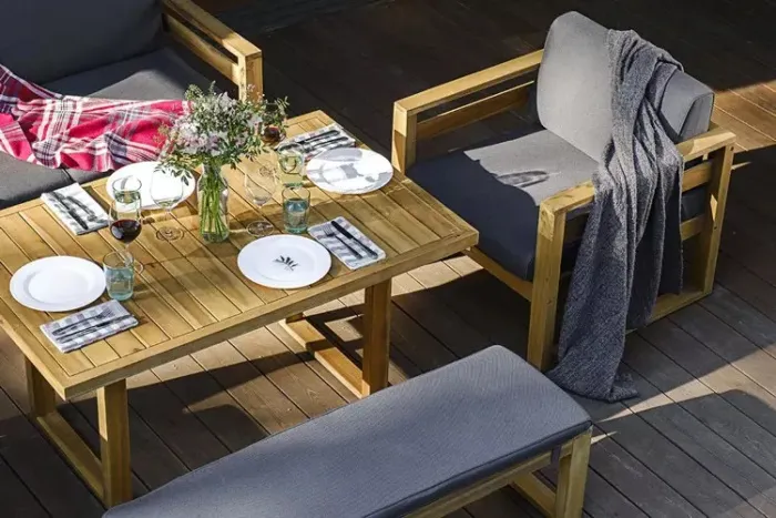 • Дерево: Классика, которая всегда в моде. Деревянная мебель выглядит благородно и естественно вписывается в ландшафт. Кедр обладает высокой устойчивостью к влаге и перепадам температур, а его аромат создает особую атмосферу. Однако дерево требует регулярного ухода – обработки защитными составами.